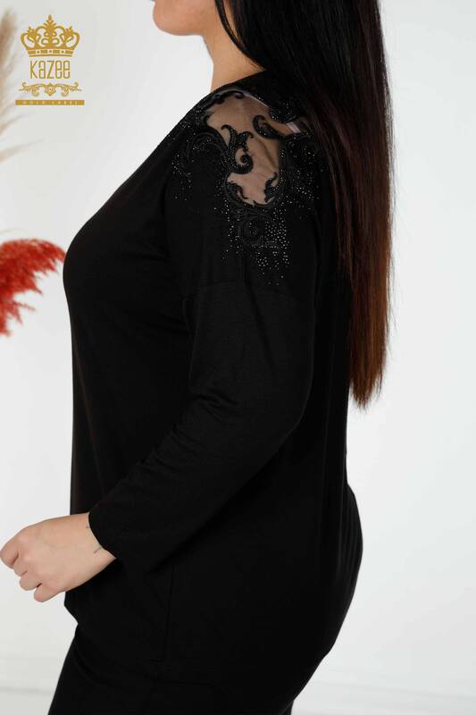 بلوزة نسائية - مزينة بحجر الكريستال ، مطرز برقبة على شكل V ، اسود - 78911 | كازي