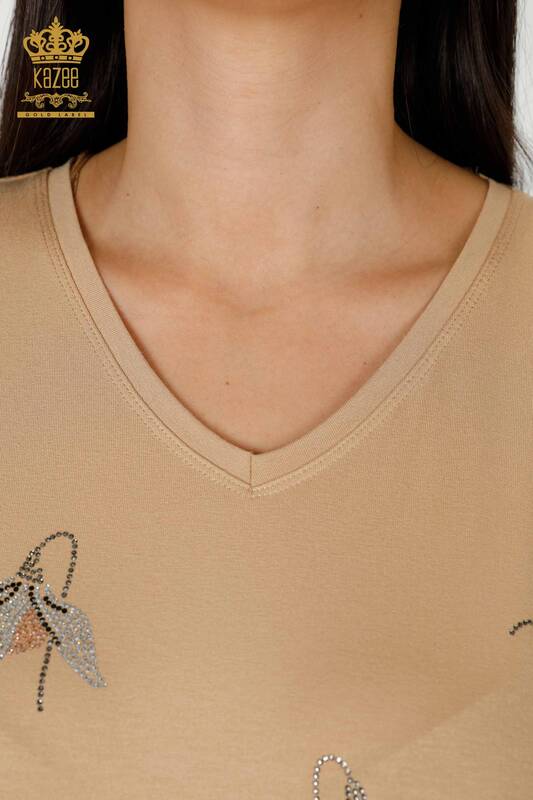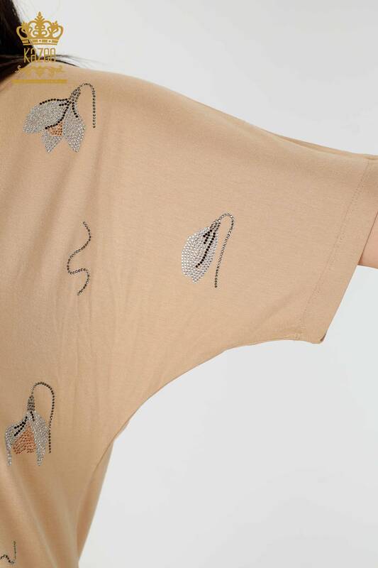 بلوزة نسائية - موديل أمريكي - بنمط زهور - مطرزة باللون البيج - 78934 | كازي