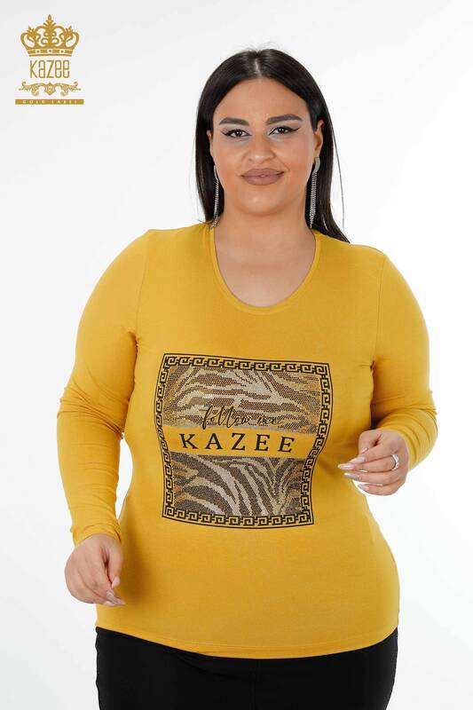 بلوزة نسائية بالجملة مع نص مفصل بياقة دائرية مطرزة بأحجار الزعفران - 78997 | كازي
