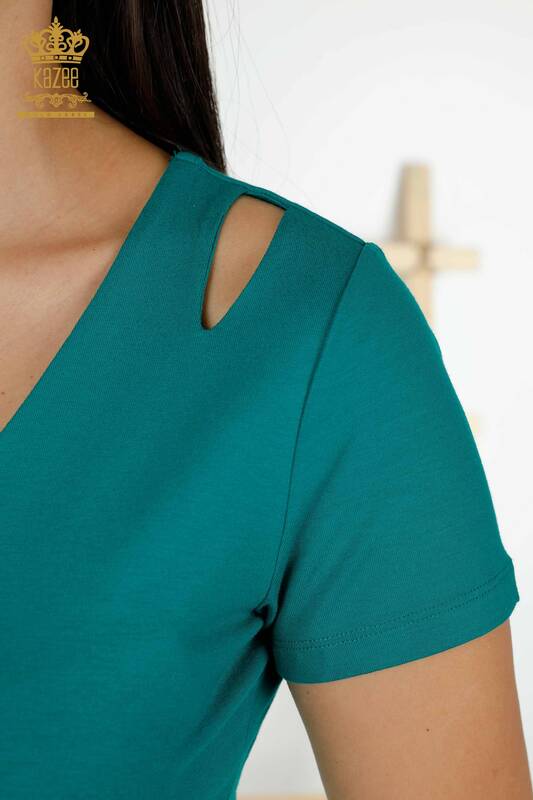 بلوزة نسائية للبيع بالجملة بأكمام قصيرة شعار أساسي مفصل الكتف أخضر - 79220 | كازي