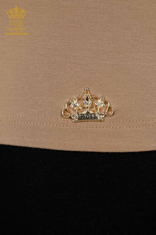 بلوزة نسائية بالجملة تفاصيل كتف بشعار أساسي بأكمام قصيرة بيج - 79220 | كازي