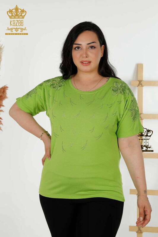 بلوزة نسائية - تول مفصلة بنقشة زهور مطرزة بأحجار الفستق الأخضر - 79086 | كازي