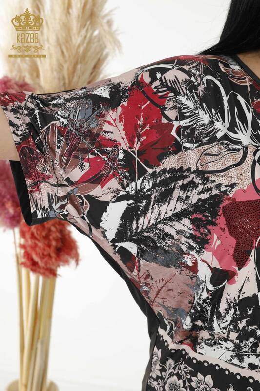 بلوزة نسائية بالجملة مطرزة بأحجار رقمية بأكمام قصيرة أسود - 12060 | كازي