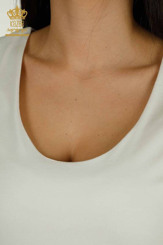بلوزة نسائية بالجملة بشعار أساسي بأكمام قصيرة بيج فاتح - 79190 | كازي
