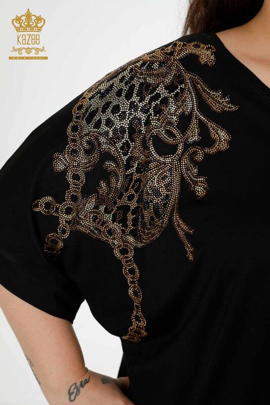 بلوزة نسائية - برقبة على شكل V ومطرزة بحجر الفهد باللون الأسود - 79064 | كازي