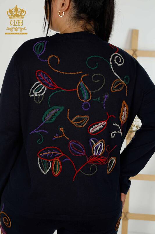 بدلة رياضية نسائية للبيع بالجملة بجيوب بسحاب منقوشة ملونة باللون الأزرق الداكن - 16657 | كازي