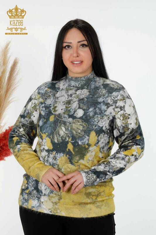 الجملة سترة نسائية تريكو كريستال ستون مطرز أنجورا طباعة رقمية زعفران - 18997 | كازي