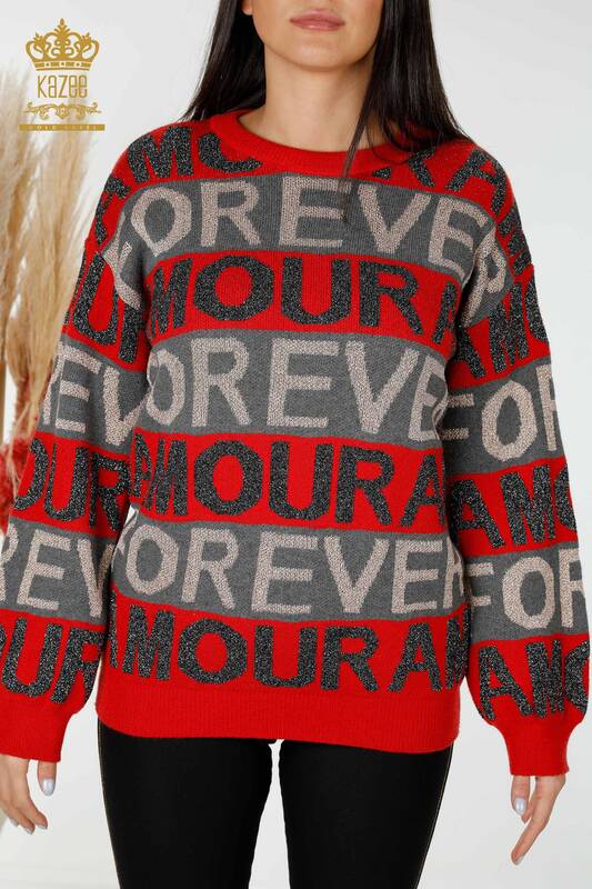 سترة نسائية تريكو نسائية بالجملة برقبة دائرية مفصل أحمر - 30022 | كازي