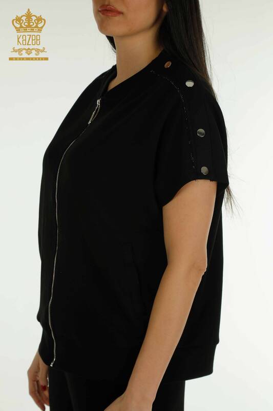 طقم رياضي نسائي بالجملة كم قصير حجر مطرز بسحاب أسود - 17680 | كازي