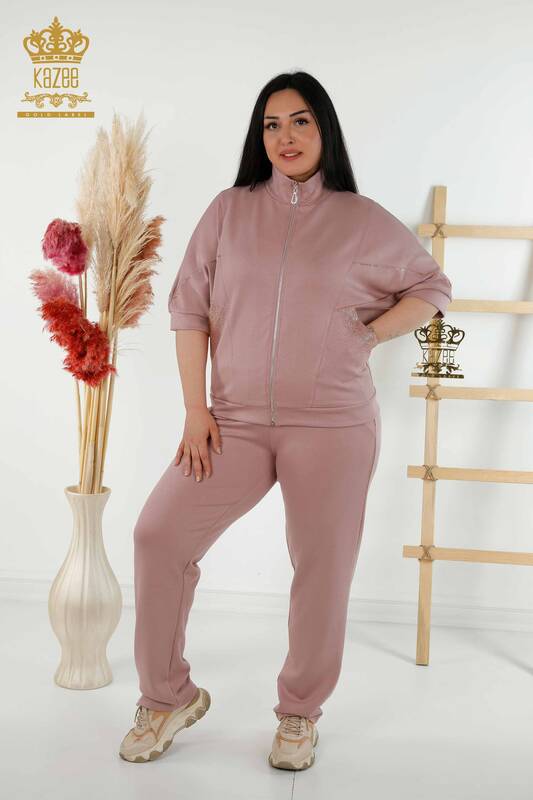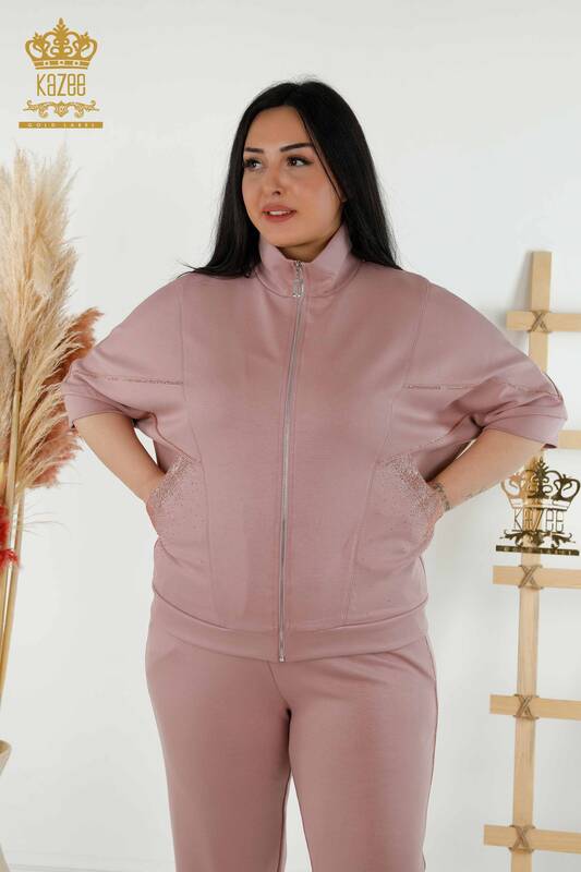 بدلة رياضية نسائية بالجملة بأكمام قصيرة وسحاب مطرزة بأحجار الورد المجفف - 17547 | كازي