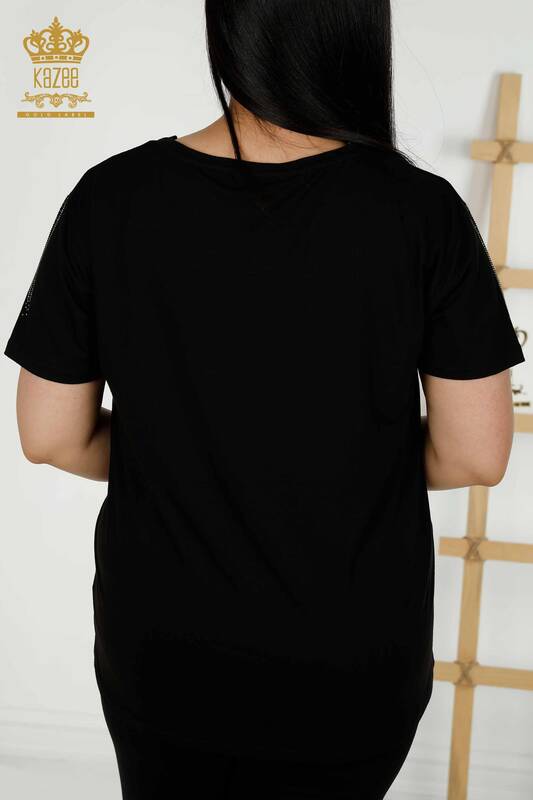 بلوزة نسائية - بأكمام قصيرة مطرزة بأحجار اليعسوب - أسود - 79370 | كازي