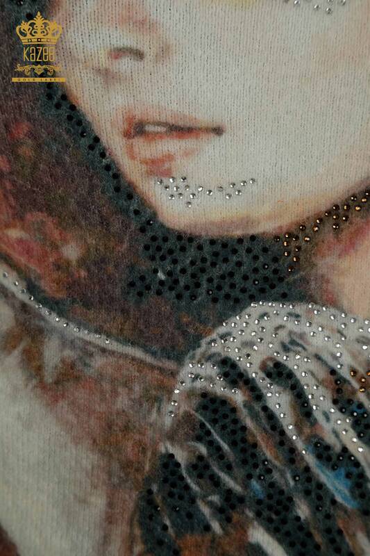 الجملة المرأة سترة تريكو الأنجورا الرقمية مطبوعة كم طويل حجر مطرز رقمي - 40042 | كازي
