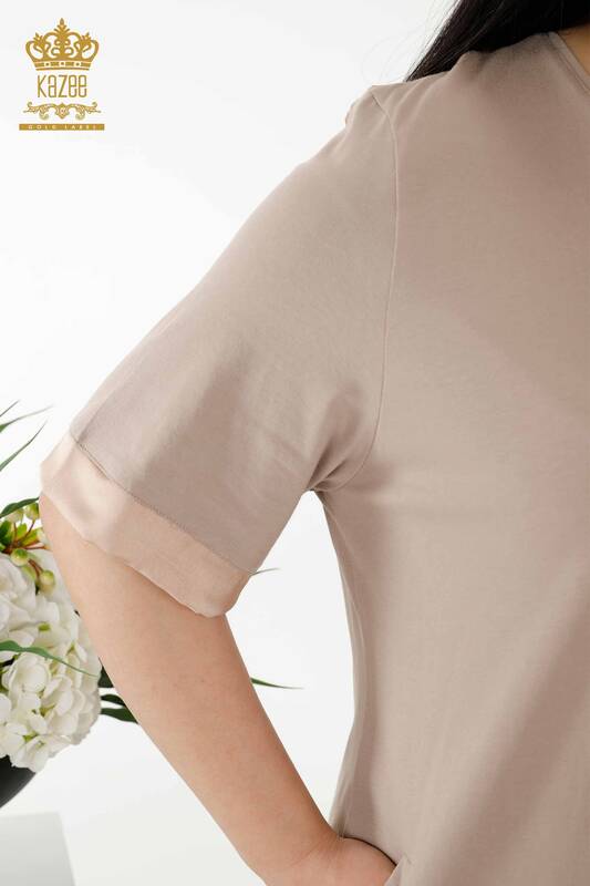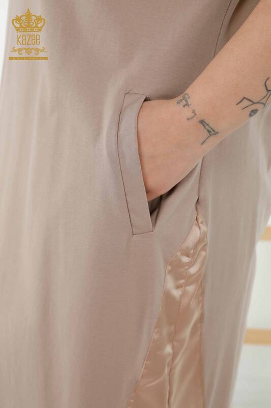 فستان نسائي للبيع بالجملة بتفاصيل من الجلد ومزين بحجر الجيب باللون البيج - 20366 | كازي