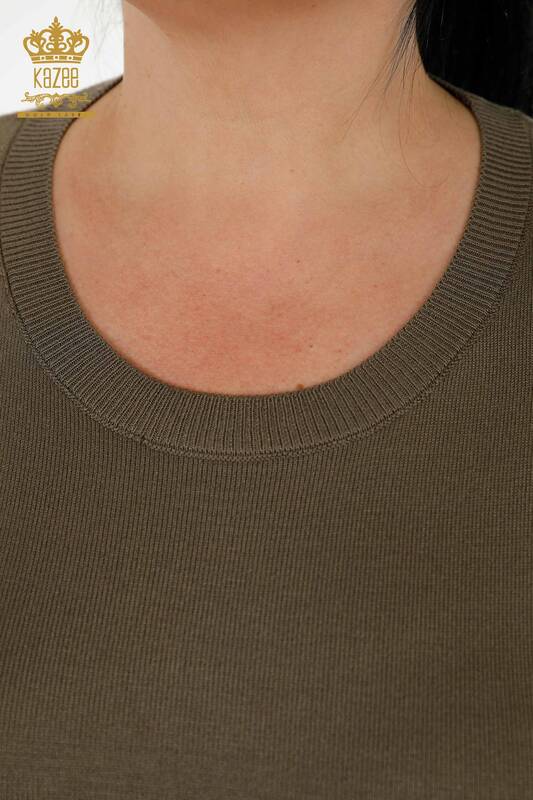 سترة تريكو نسائية بالجملة بشعار أساسي بياقة دائرية كاكي - 30213 | كازي
