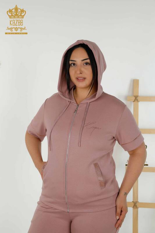 بدلة رياضية نسائية للبيع بالجملة مقنعين ستون مطرزة بالجيب وردة مجففة - 20392 | كازي