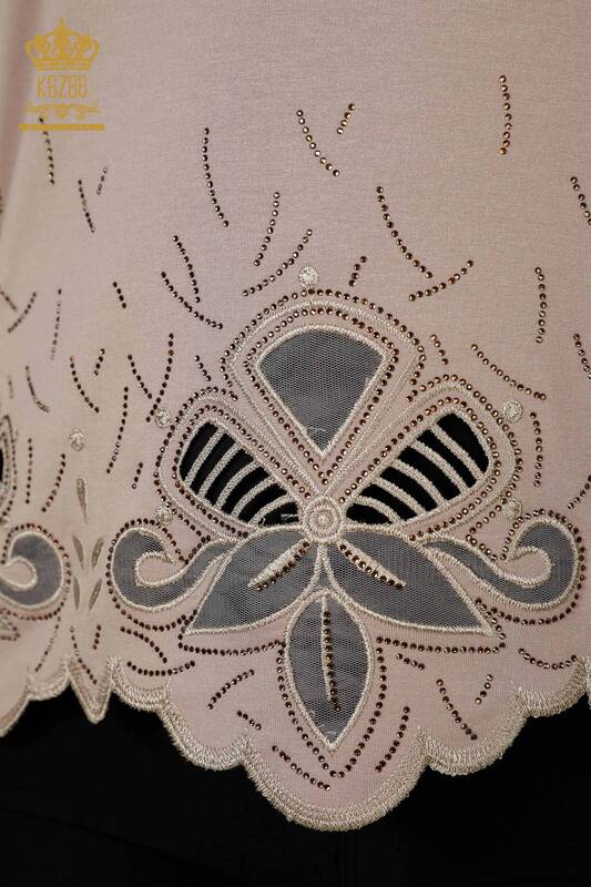 بلوزة نسائية بالجملة مطرزة بأحجار تول ومفصلة بياقة على شكل V بيج - 77927 | كازي