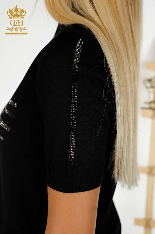 الجملة سترة نسائية تريكو مطرزة بالحجر كم قصير أسود - 30491 | كازي