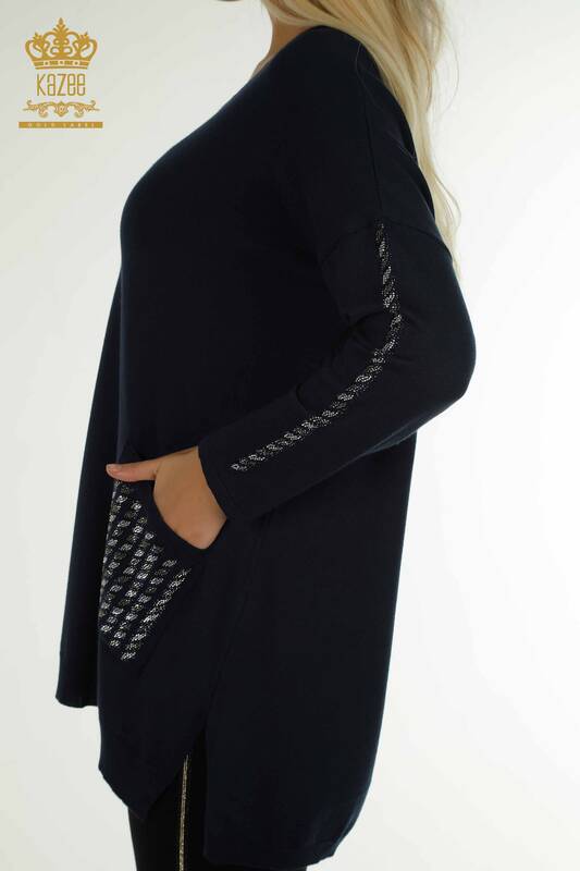 الجملة المرأة سترة تريكو جيب مفصلة الحجر المطرز الأزرق الداكن - 30591 | كازي