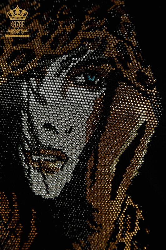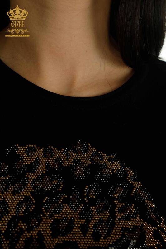 الجملة المرأة سترة تريكو مجسم حجر مطرز كم طويل أسود - 30102 | كازي
