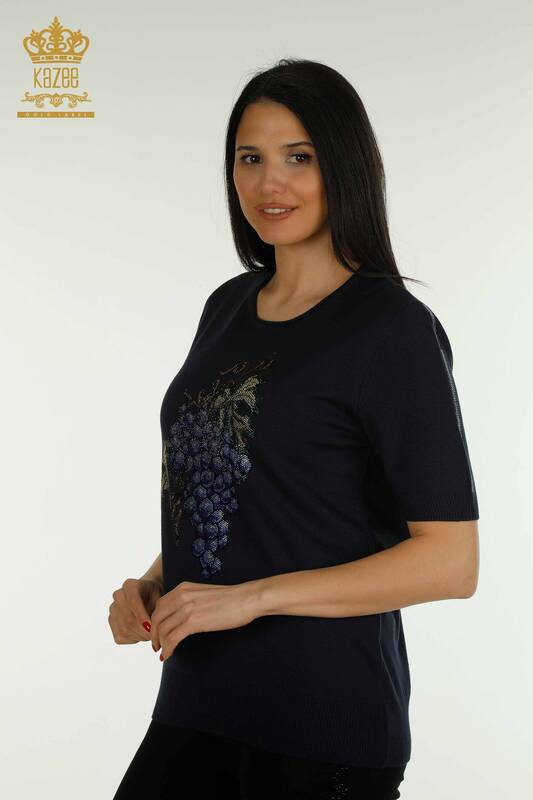 الجملة المرأة سترة تريكو العنب منقوشة حجر مطرز الأزرق الداكن - 30488 | كازي