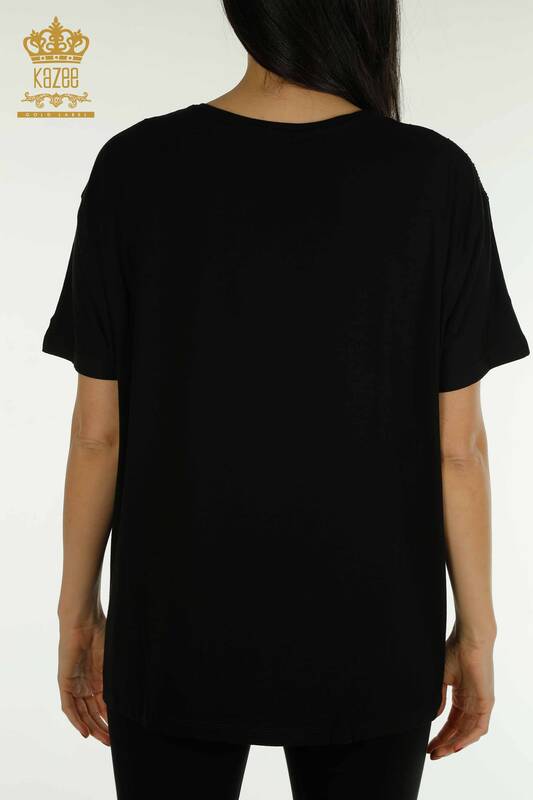 بلوزة نسائية - جيبين بأكمام قصيرة مطرزة بالأحجار السوداء - 79293 | كازي