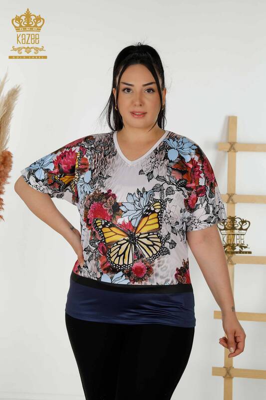 بلوزة نسائية - بأكمام قصيرة مزخرفة بأحجار الفراشة - أزرق كحلي - 12026 | كازي