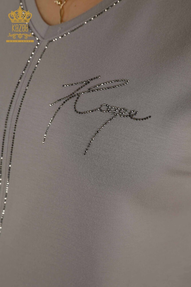 بدلة رياضية نسائية للبيع بالجملة مطرّزة بالجيب بأكمام قصيرة رمادي - 20391 | كازي
