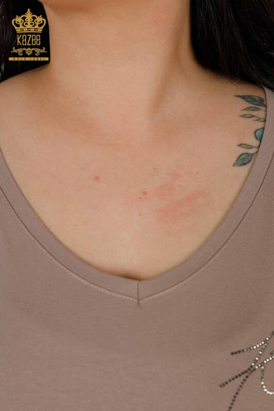 Commercio all'ingrosso Camicetta da donna Bottone Dettagliato Pietra ricamata Manica corta Visone - 79297 | KAZEE