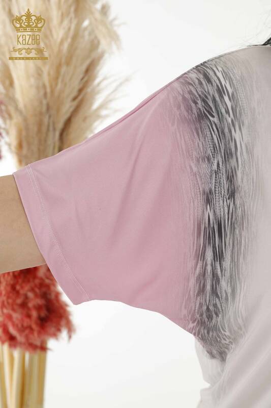 Camicetta da donna all'ingrosso motivo floreale pietra ricamata manica corta lilla - 77769 | KAZEE