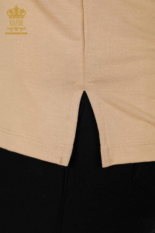 Camicetta da donna all'ingrosso con motivo a foglie ricamate in pietra ricamata beige - 77913 | KAZEE