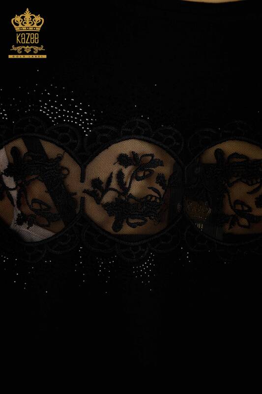 Camicetta da donna all'ingrosso manica corta dettaglio tulle ricamato pietra nera - 79302 | KAZEE