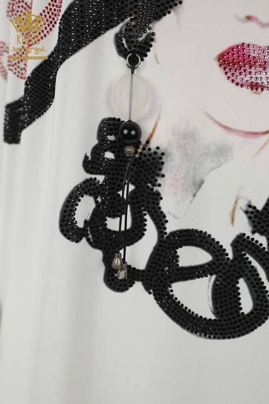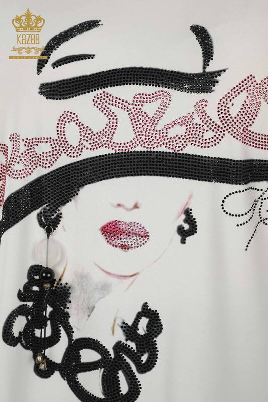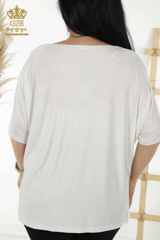 Camicetta da donna all'ingrosso Stampa digitale Pietra ricamata manica corta Ecru - 77756 | KAZEE