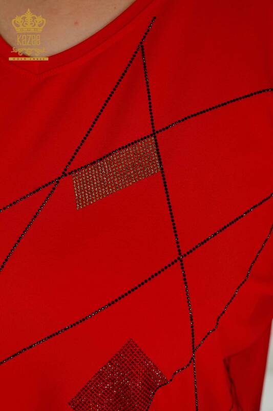 Camicetta da donna all'ingrosso con scollo a V pietra ricamata manica corta rossa - 79320 | KAZEE