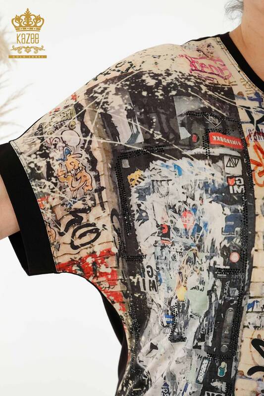Camicetta da donna all'ingrosso manica corta ricamata in pietra con stampa digitale - 12078 | KAZEE
