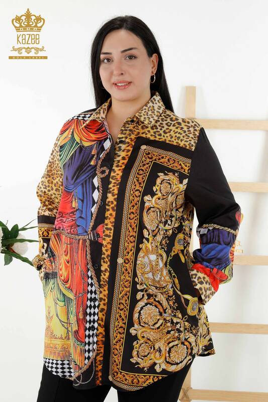 Camicia da donna all'ingrosso con stampa digitale ricamata in pietra - 20357 | KAZEE