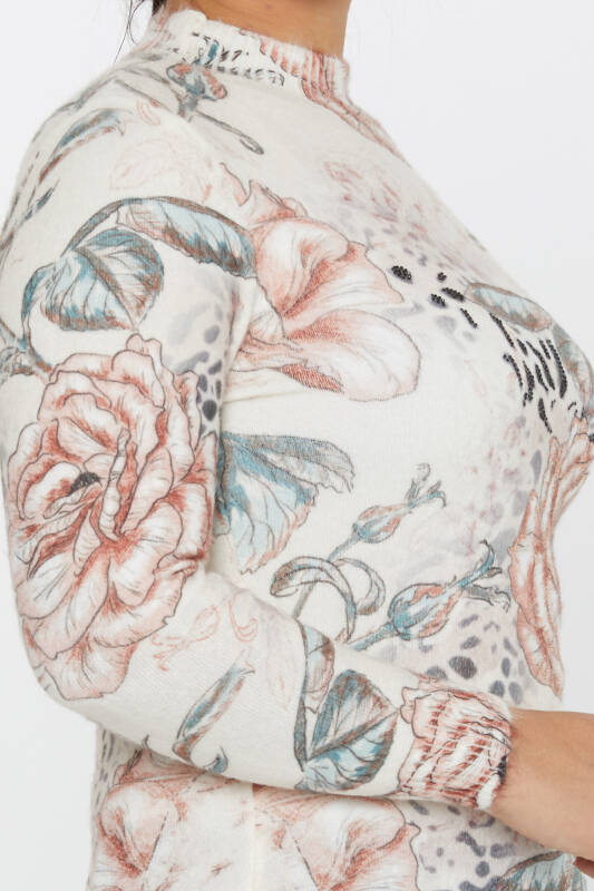 Angora Triko Çiçek Desenli Taş İşlemeli Ekru - 50001 | KAZEE (2'li Set S-M)