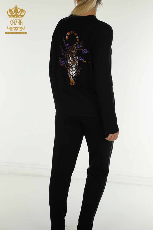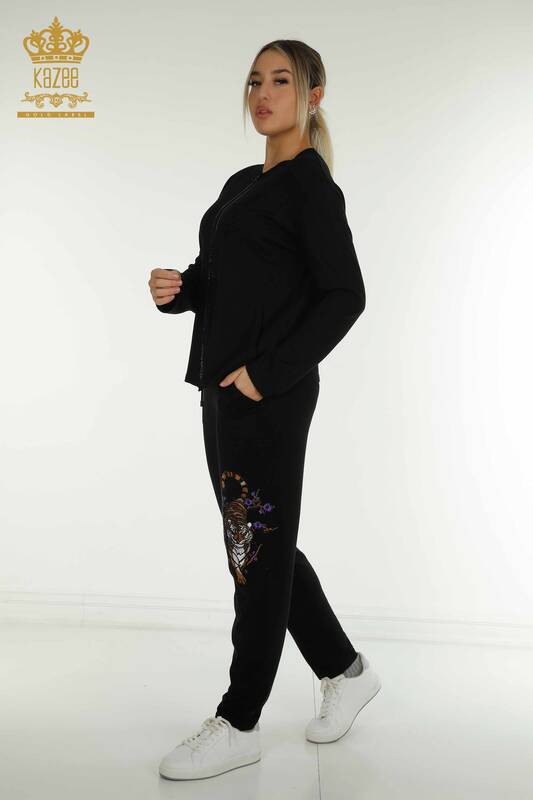 Set de trening cu ridicata pentru femei, fermoar brodat cu piatra, negru cu model leopard - 16662 | KAZEE