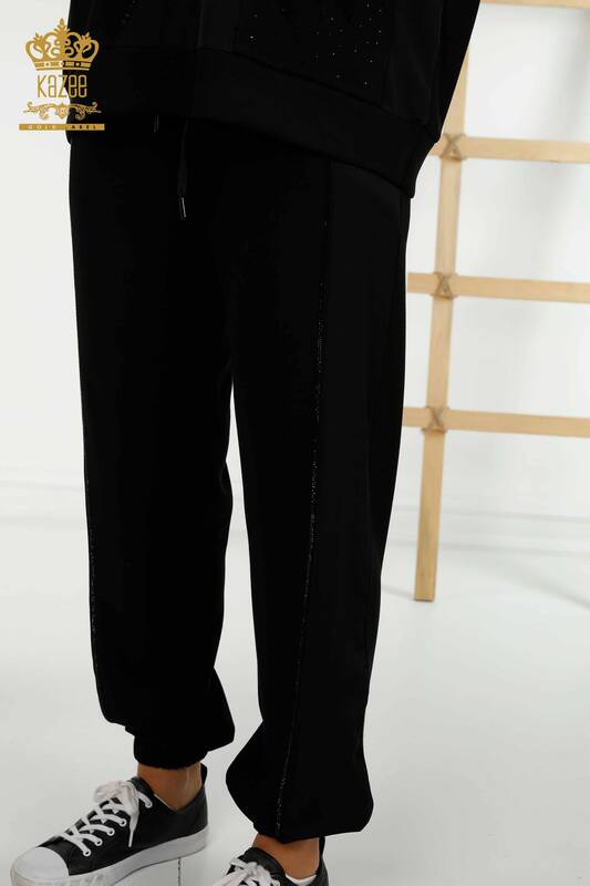 Set de trening pentru femei negru cu buzunare brodate cu piatra cu gluga - 17575 | KAZEE
