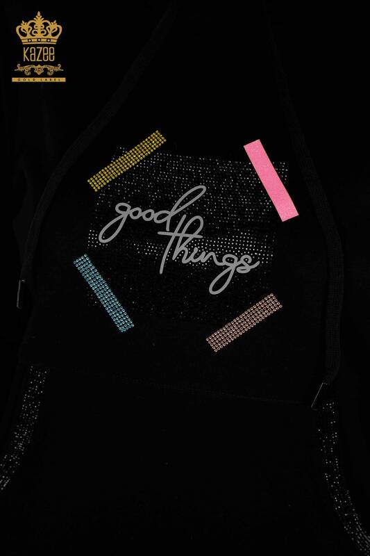 Set de trening pentru femei cu glugă, brodat cu piatră, negru - 17592 | KAZEE