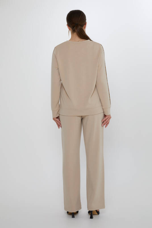 طقم رياضي مخطط بتفاصيل شريط مطرز باللون البيج - 17902 | كازي (مجموعة من 3 مقاسات L-XL-2XL)