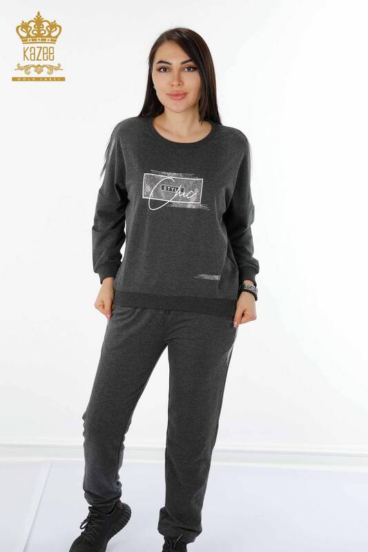 بدلة رياضية نسائية بالجملة مطرزة بحجر الكريستال بجيب مفصل بحروف أنثراسايت - 17461 | كازي