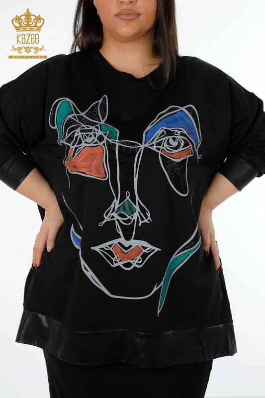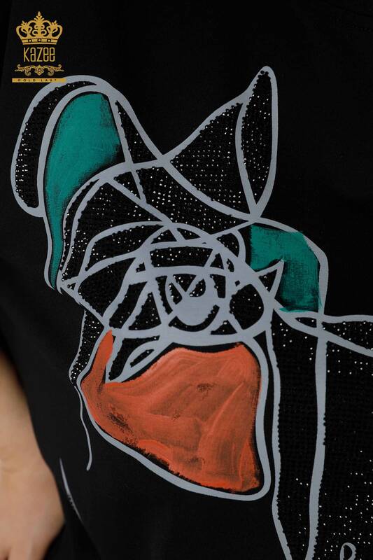 تونك نسائي - ياقة دائرية مزخرفة بأحجار مطرزة بالأسود - 17365 | كازي