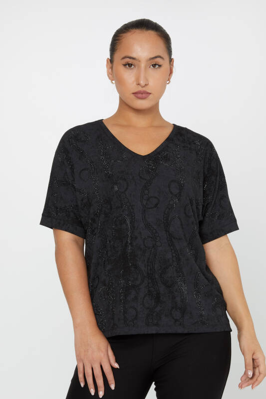 بلوزة كم قصير حجر مطرز أسود - 79991 | كازي (مجموعة من 3 مقاسات M-L-XL)
