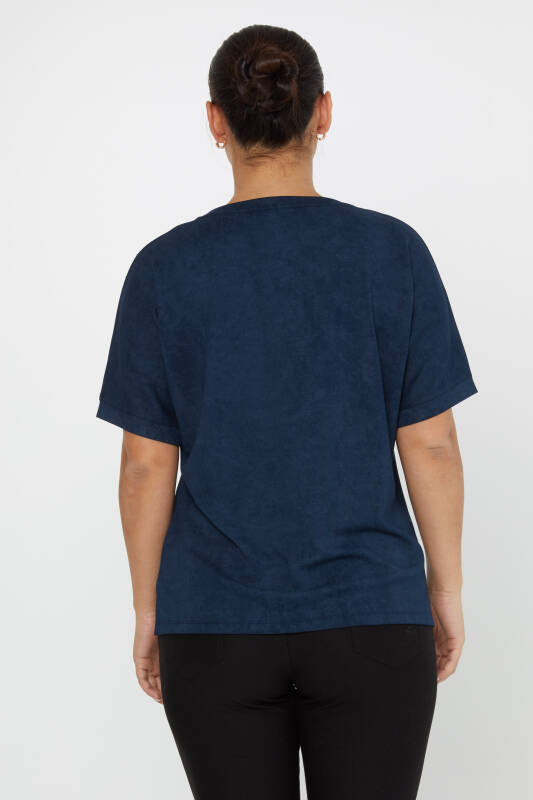 بلوزة نمط حجر مطرز كم قصير أزرق داكن - 79990 | كازي (مجموعة من 3 مقاسات M-L-XL)