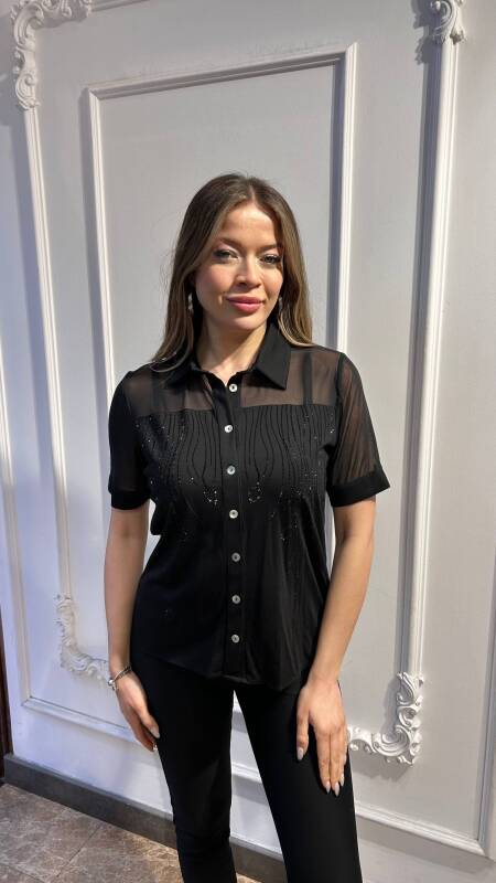 بلوزة سوداء مزينة بأزرار وأحجار - 80185 | كازي (طقم من 3 قطع: M-L-XL)
