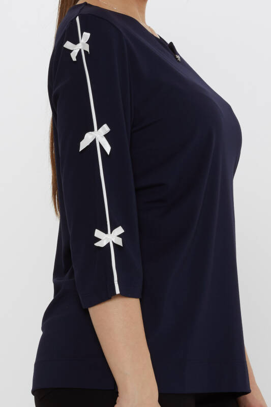 بروش بأكمام على شكل فيونكة وبلوزة أزرق داكن - 80051 | كازي (مجموعة من 3 مقاسات L-XL-2XL)