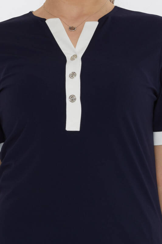 بلوزة بأكمام قصيرة وأزرار ورقبة على شكل حرف V باللون الأزرق الداكن - 80024 | كازي (مجموعة من 3 مقاسات M-L-XL)