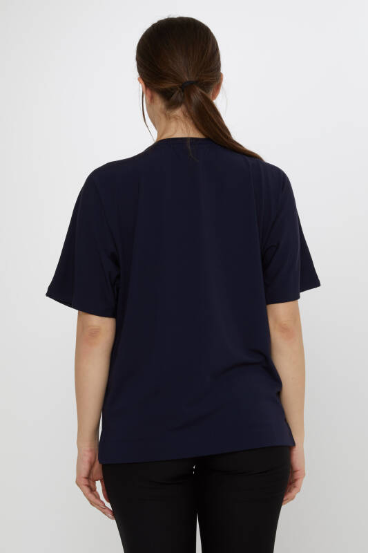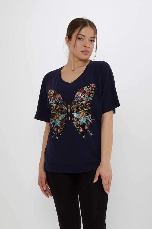 بلوزة مطرزة بأحجار ملونة على شكل فراشة باللون الأزرق الداكن - 80046 | كازي (مجموعة من 3 مقاسات L-XL-2XL)