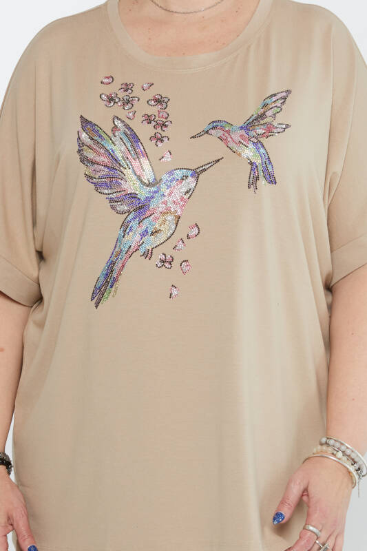 بلوزة مطرزة بحجر ونقوش طيور باللون البيج - 79948 | كازي (مجموعة من 4 مقاسات M-L-XL-2XL)