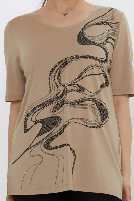 بلوزة منقوشة بأحجار وأكمام قصيرة باللون البيج - 80078 | كازي (مجموعة من 3 مقاسات L-XL-2XL)